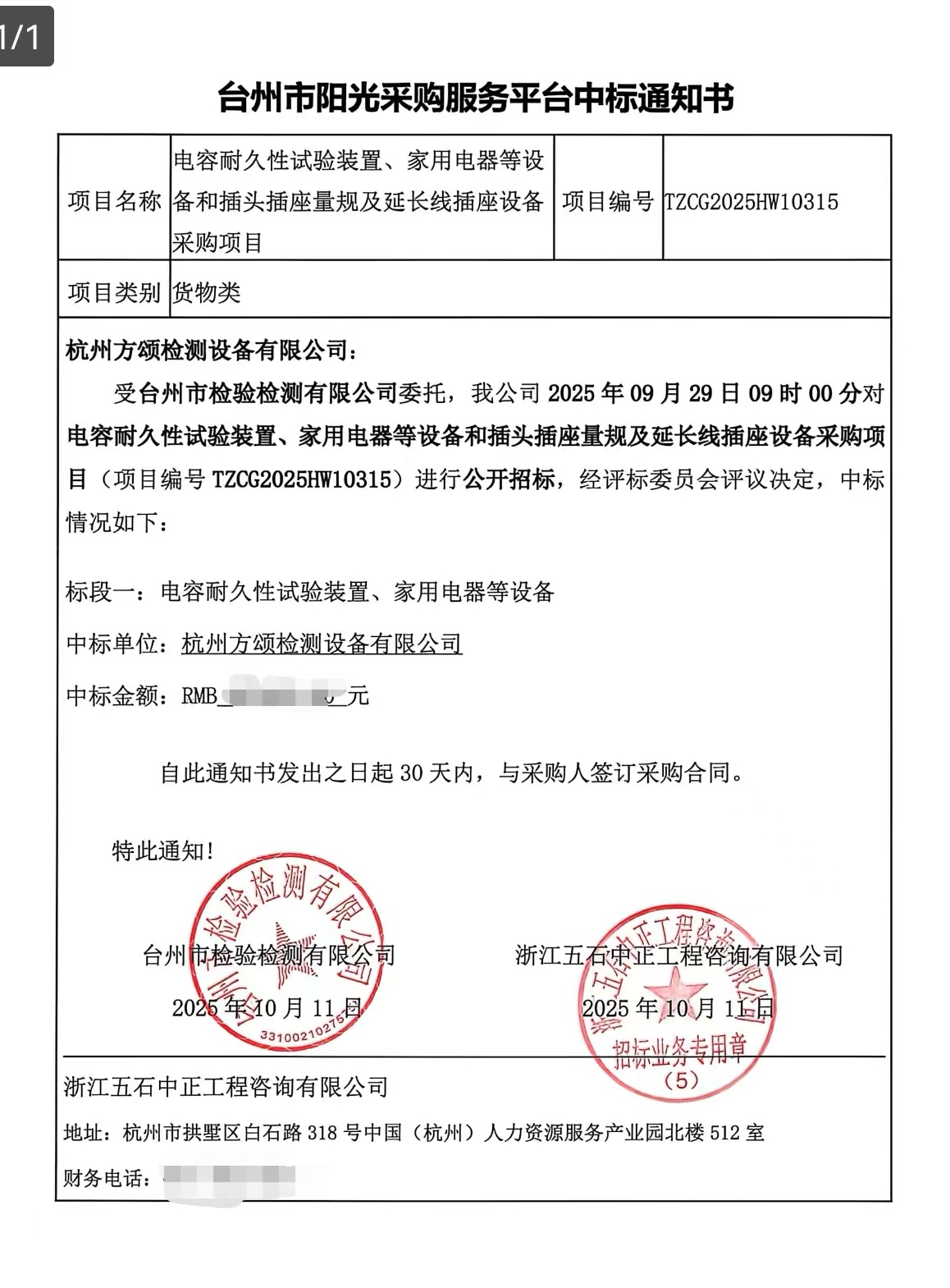 欣報(bào)佳音,捷傳喜訊!近日,在電容耐久性試驗(yàn)裝置、家用電器等設(shè)備和插頭插座量規(guī)及延長線插座設(shè)備采購項(xiàng)目中,杭州方頌檢測設(shè)備有限公司憑借卓越的產(chǎn)品性能、領(lǐng)先的技術(shù)方案、完善的售后服務(wù)體系以及合理的報(bào)價(jià),在眾多優(yōu)秀競爭者中脫穎而出,成功中標(biāo)!