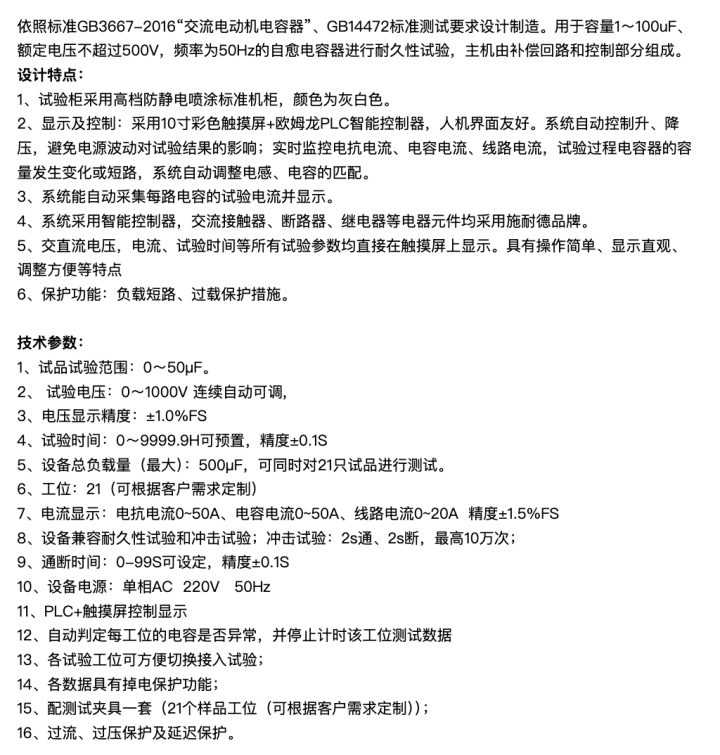依照標(biāo)準(zhǔn)GB3667-2005“交流電動機電容器”GB14472標(biāo)準(zhǔn)測試要求設(shè)計制造。用于容量1~100uF、額定電壓不超過500V,頻率為50Hz的自愈電容器進行耐久性試驗,主機由補償回路和控制部分組成。
