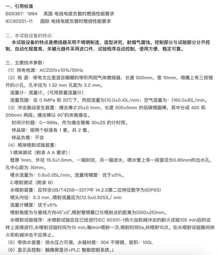 依據國標GB/T19216.1-2021、GB/T19216.2-2021要求,用于測試電線電纜在一定的火源和時間下能持續(xù)在指定狀態(tài)下運行的能力。具體包含電纜耐火實驗、噴淋燃燒實驗、捶擊燃燒實驗測試,綜合檢測電線電纜在各種復雜情況下的阻燃性能。
