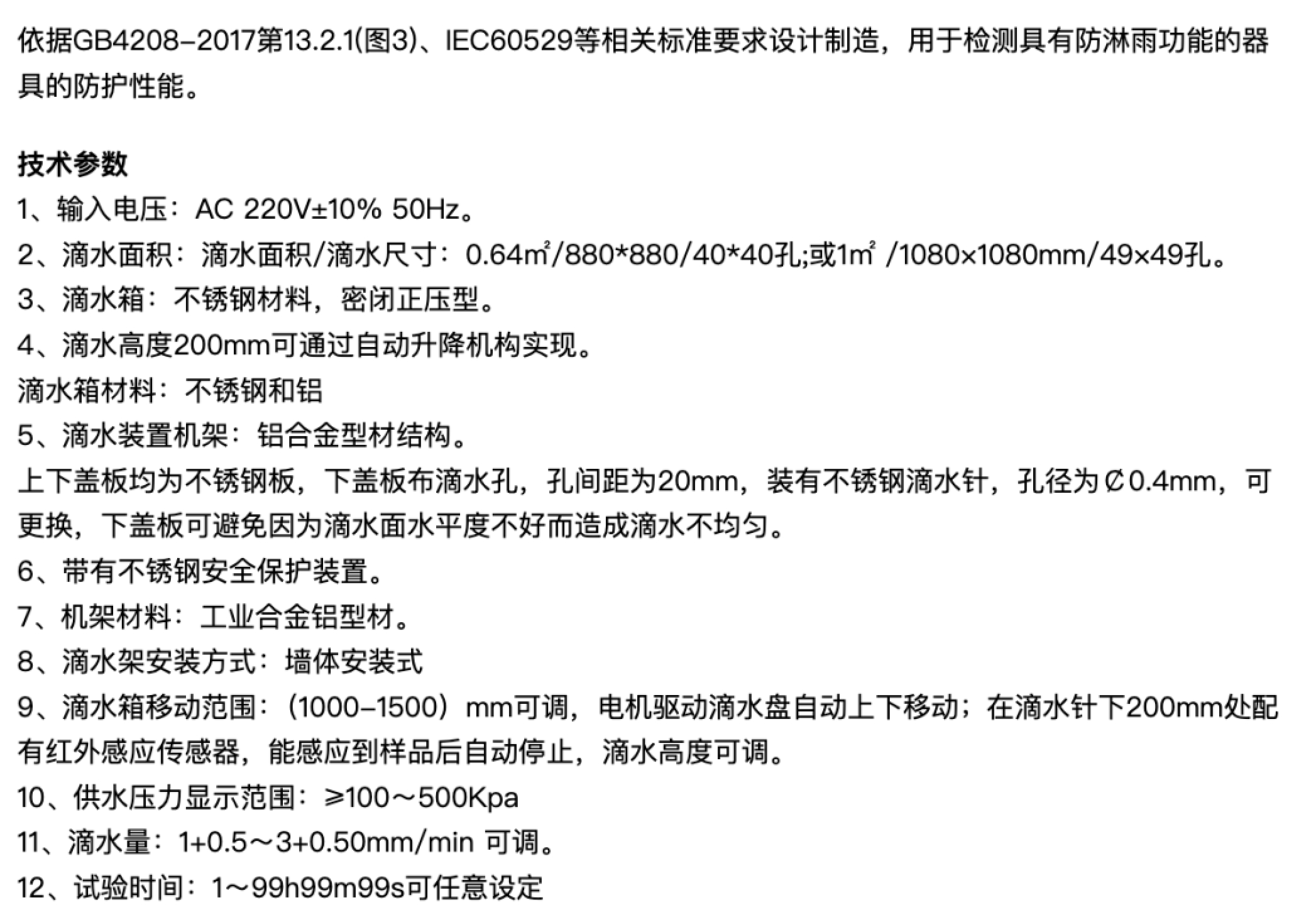 垂直滴水試驗裝置(IPX1/IPX2)FS8102依據(jù)GB4208-2017第13.2.1(圖3)、IEC60529等相關標準要求設計制造,用于檢測具有防淋雨功能的器具的防護性能。