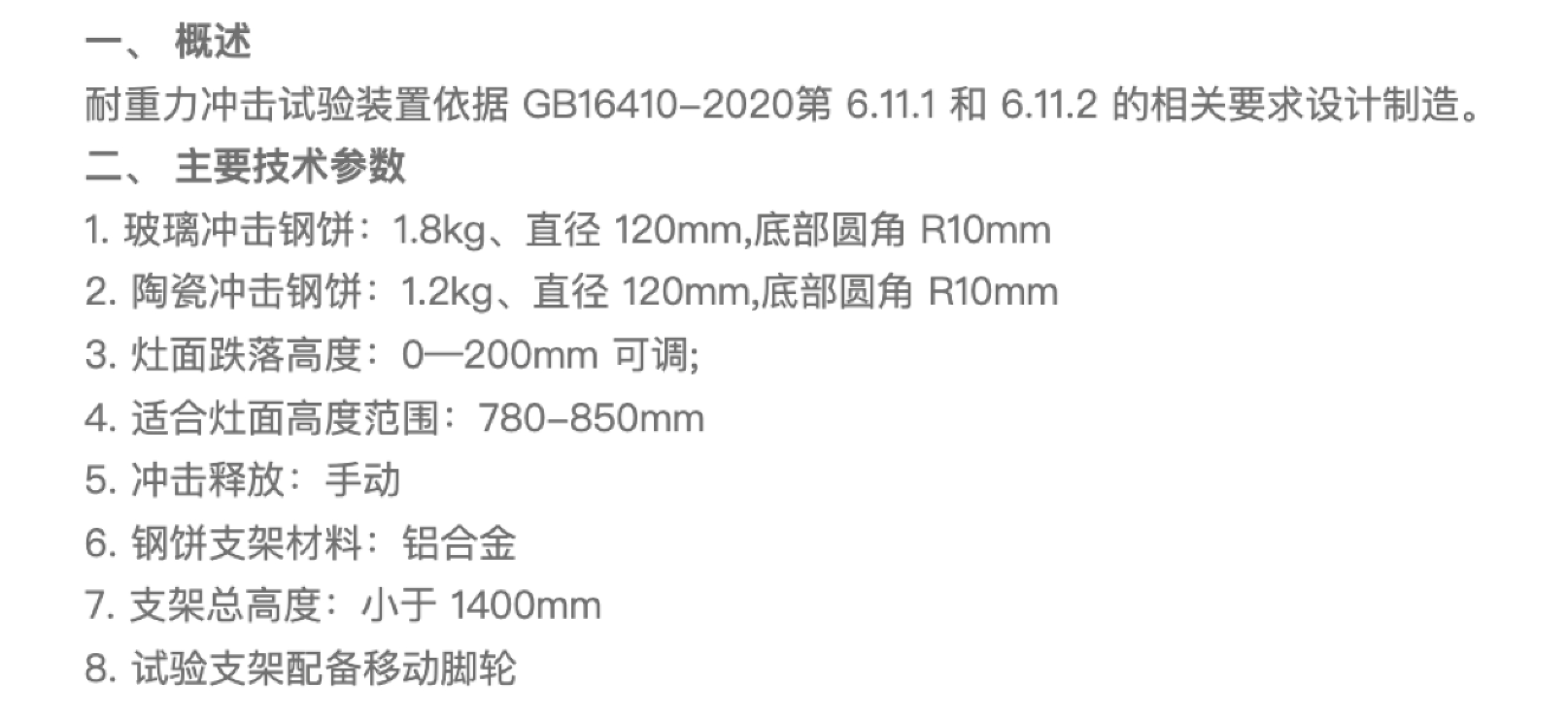 耐重力沖擊試驗裝置FS9174G的耐重力沖擊試驗裝置依據(jù) GB16410-2020第 6.11.1和6.11.2 的相關(guān)要求設(shè)計制造。