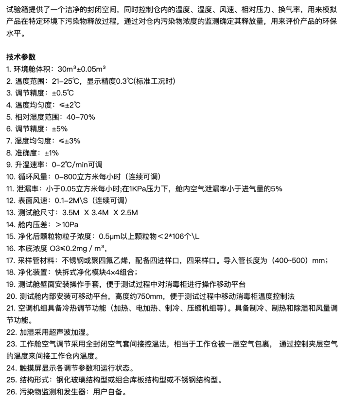 依據(jù)GB/T18801-2015《空氣凈化器》GB/T 21551.3-2010《家用和類似用途電器的除菌、凈化功能空氣凈化器的特殊要求參照標(biāo)準(zhǔn)》GB/T 18883《室內(nèi)空氣質(zhì)量標(biāo)準(zhǔn)》GB/T50243《通風(fēng)與空調(diào)工程施工質(zhì)量驗(yàn)收規(guī)范》的要求設(shè)計(jì)制作。該環(huán)境測(cè)試艙主要用來模擬產(chǎn)品在接近人們居住的環(huán)境下釋放 VOC(甲醛)的儀器設(shè)備,用來測(cè)試家具、建材、汽車內(nèi)飾等產(chǎn)品中有害物質(zhì)釋放量的多少.