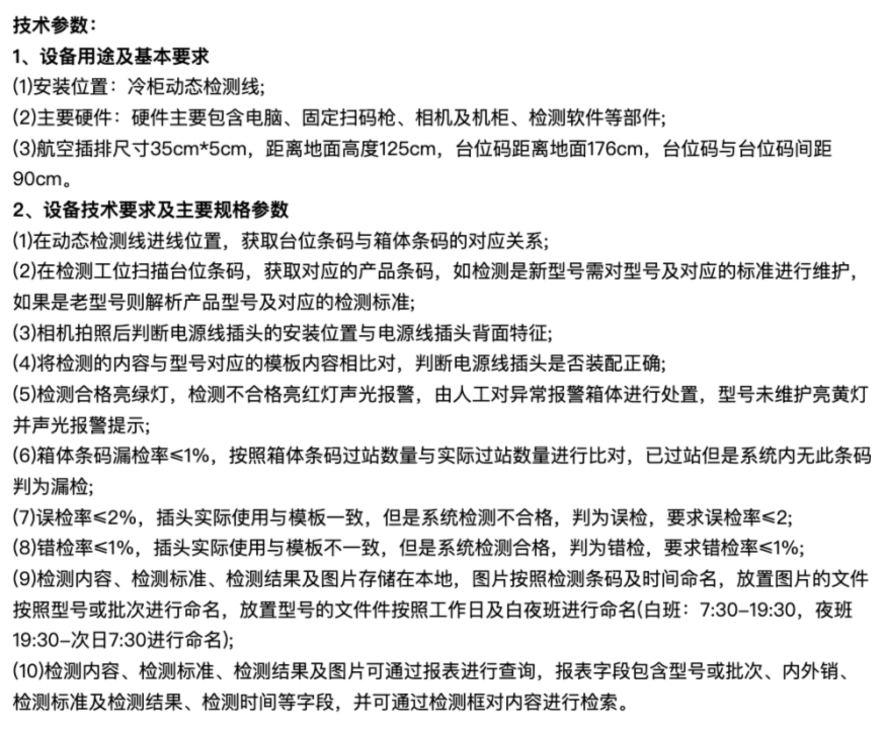 本電源線視覺檢測(cè)設(shè)備是用于生產(chǎn)流水線動(dòng)態(tài)檢測(cè)可根據(jù)型號(hào)維護(hù)電源線插頭在航空插排上的位置檢測(cè)其電源線插頭的特征。通過掃碼確定產(chǎn)品型號(hào)及模板、相機(jī)識(shí)別電源線插頭特征的方式,確定電源線是否裝配正確。對(duì)于條碼漏掃及識(shí)別電源線錯(cuò)誤具備停線報(bào)警的功能,檢測(cè)的條碼及照片信息保存在本地?cái)?shù)據(jù)庫(kù)并生成報(bào)表,可通過檢測(cè)時(shí)間及條碼查詢追溯。